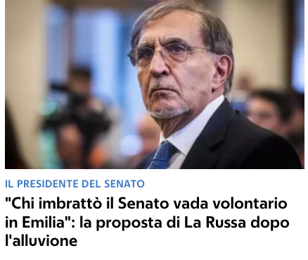 "Chi imbrattò il Senato", ci sono ottime possibilità che in #EmiliaRomagna ci sia già, senza bisogno dell'invito (ipocrita) del camerata Ignazio #larussa che, invece, bada bene a non sporcare il suo vestito elegante e ben stirato, ben adatto al comfort in cui vive agiatamente.