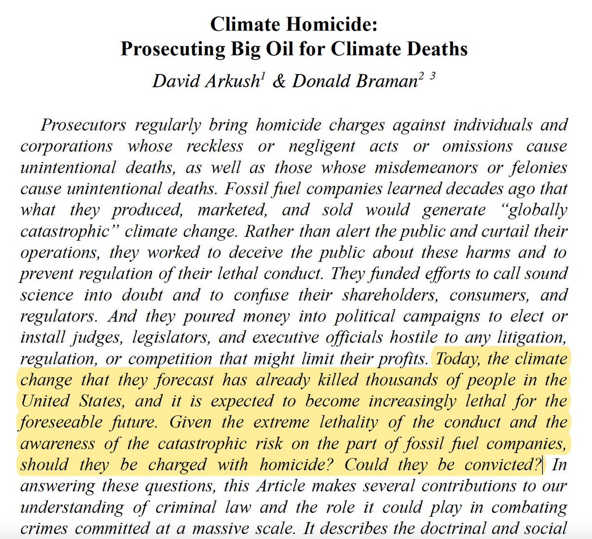 Harvard Law Review paper posits taking climate court action to new levels: #climatehomicide. @davidbraman9: "Culpable mental state causing harm is criminal conduct, and if they kill anybody, that’s homicide.” Paper: https://papers.ssrn.com/sol3/papers.cfm?abstract_id=4335779 Recalling @DrJamesEHansen in '07-8:…