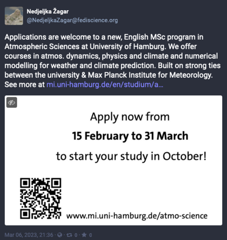 Are you looking for a #master program and are interested in the Earth's #atmosphere and #climate? Apply now for the new international MSc program on Atmospheric Science offered by Universität Hamburg and profit from the unique network in the field of #ClimateResearch we have in Hamburg! Find more details here: https://www.mi.uni-hamburg.de/en/studium/atmo-science.html @NedjeljkaZagar