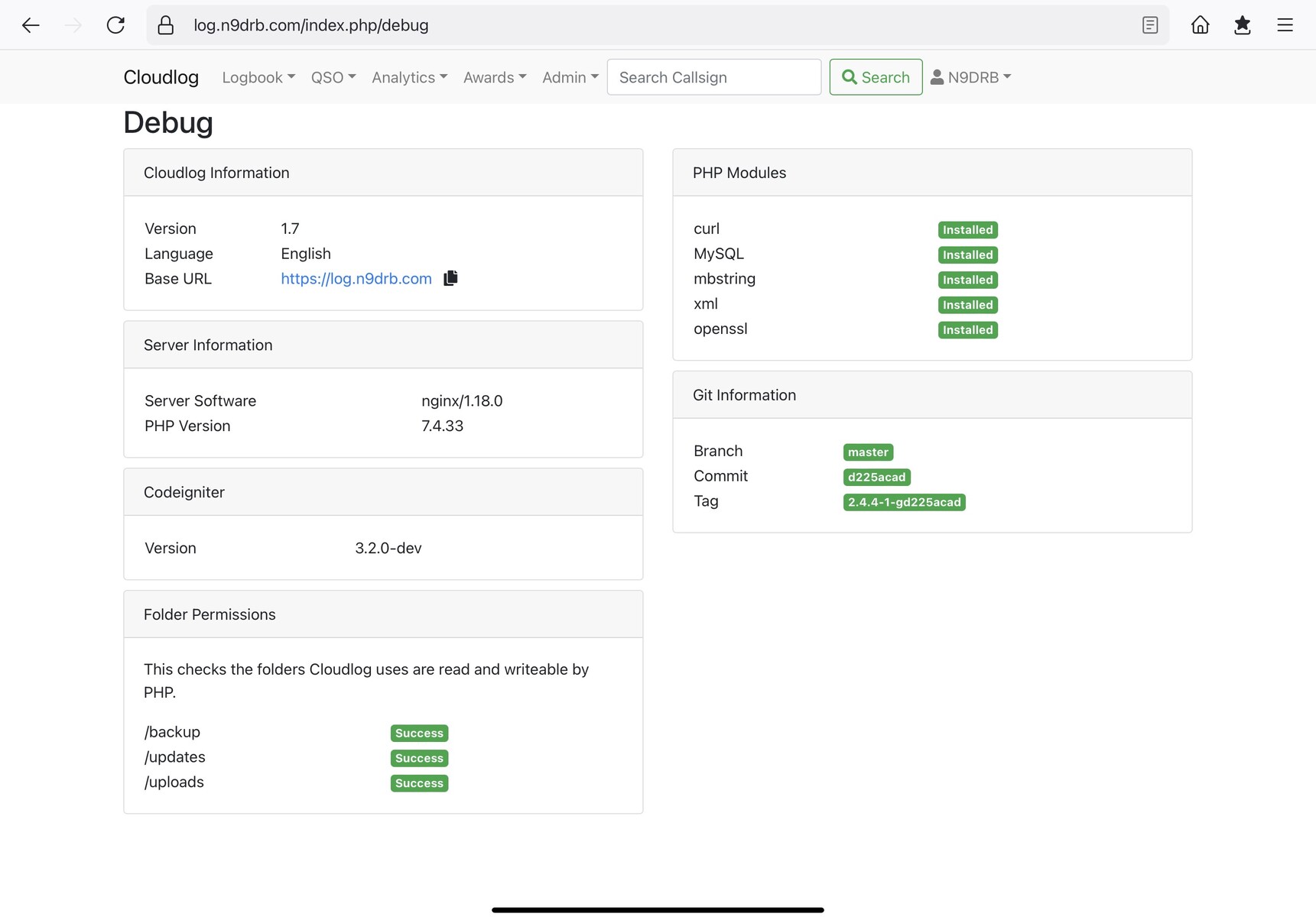 Probably a dumb question for folks using #CloudLog. I use the automatic upgrade method via nightly git pull. Looking at my install debug page, it says I’m on version 1.7, but the git information shows 2.4.4 as the tagged version. So which version am I on?