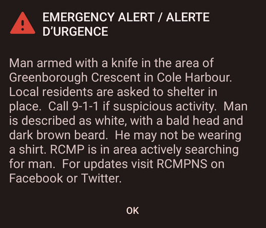 Emergency Alert: RCMP & Police Dog Services is in area of Greenborough Cres. in #ColeHarbour searching for man armed with a knife. Local residents: Call 911 in case of suspicious activity. Man described as white, bald head, dark brown beard. May not be wearing a shirt.