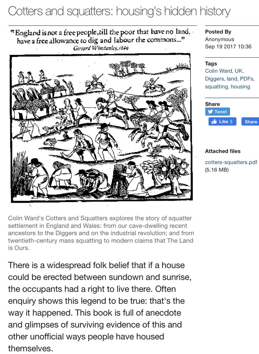 "The hidden history of housing" discussed UK 20thC https://theanarchistlibrary.org/library/colin-ward-the-hidden-history-of-housing & book version Cotters and Squatters (2004) https://libcom.org/history/cotters-squatters-housings-hidden-history
