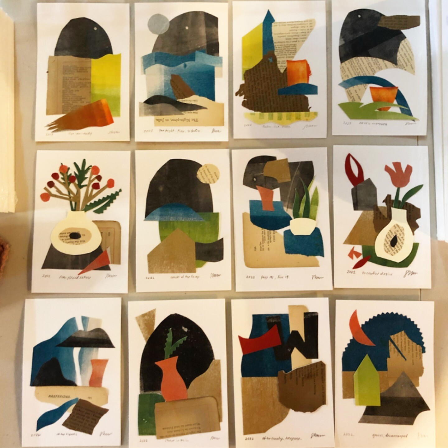 This series is 12, w/ a shared color palette of my hand-printed papers + at least one piece of an antique book. (I got a box from father-in-law, 1880s, found in a shack in the woods.) The titles come from the book piece. I have 7 left, but not on the website yet.