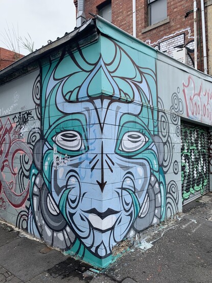 Cool art on the corner (literally) of Bedford and Perry Streets in Collingwood, Melbourne. You had to be walking in the middle of the street to really see this art properly – which I happened to be doing. During the pandemic I got into the habit of wandering around down the middle of quiet streets in Fitzroy and Collingwood. :)