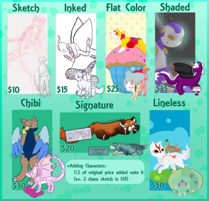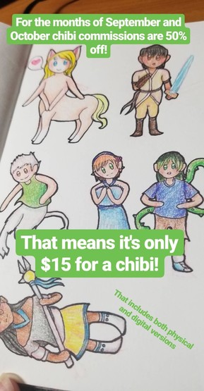 I do commissions! And currently for the rest of September and for October chibis are 50% off. Message me here or at Faireh@live.com with any jobs or questions.