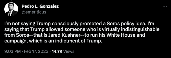 i wonder what this guy with bylines at #Newsweek, #FoxNews, #NewYorkPost, #CompactMagazine, etc meant when he said that Jared Kushner "is virtually indistinguishable from Soros"? https://twitter.com/lionel_trolling/status/1634994568822407168