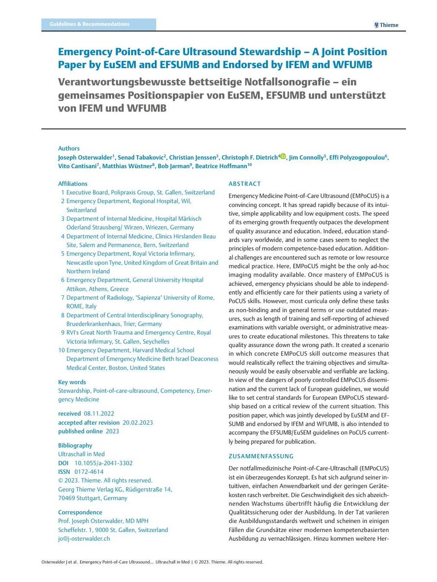 Emergency Point-of-Care #Ultrasound Stewardship – A Joint Position Paper by @EuropSocEM and @efsumb_kosmos and Endorsed by @IFEM2 and @WFUMB