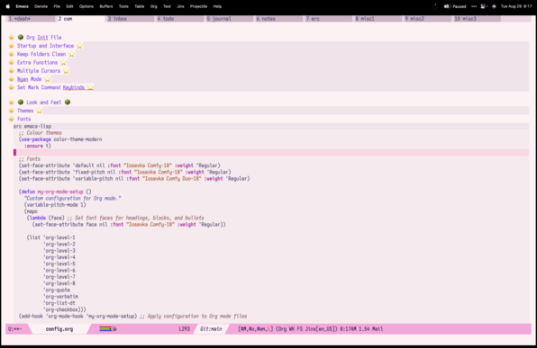 Okay, speaking of changes since I'm back home after so long, I decided to give my Emacs a little makeover. I started with Iosevka Comfy last night from Prot. Look how nice it looks!