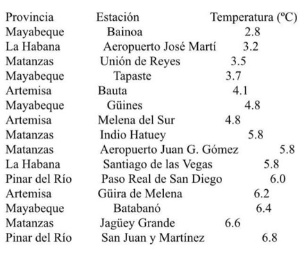 La noche de ayer y la madrugada y amanecer de hoy en el Occidente y el Centro de Cuba fue sumamente fría para las temperaturas a las que estamos acostumbrados. En un total de 34 estaciones meteorológicas se registraron temperaturas mínimas inferiores a 10 ºC, de las cuales 13 eran menores que 7 ºC. El valor más bajo registrado fue en Bainoa con 2.8 °C, demostrado, una vez más, porqué esa localidad de Jaruco, en Mayabeque, es conocida como la Capital del Frío en Cuba.