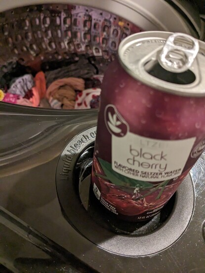 Disregard instructions on Samsung washing machine cupholders. Recall needed. #consumersafety (caption: black cherry seltzer water in a "liquid bleach only"-branded cupholder)