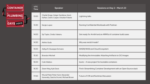 Thank you all for joining us on Day 1 of Container Plumbing Days! 🥳 We had lots of great discussions thanks to our speakers today. Hope you join us also tomorrow (March 23), for Day 2: https://containerplumbing.org/schedule