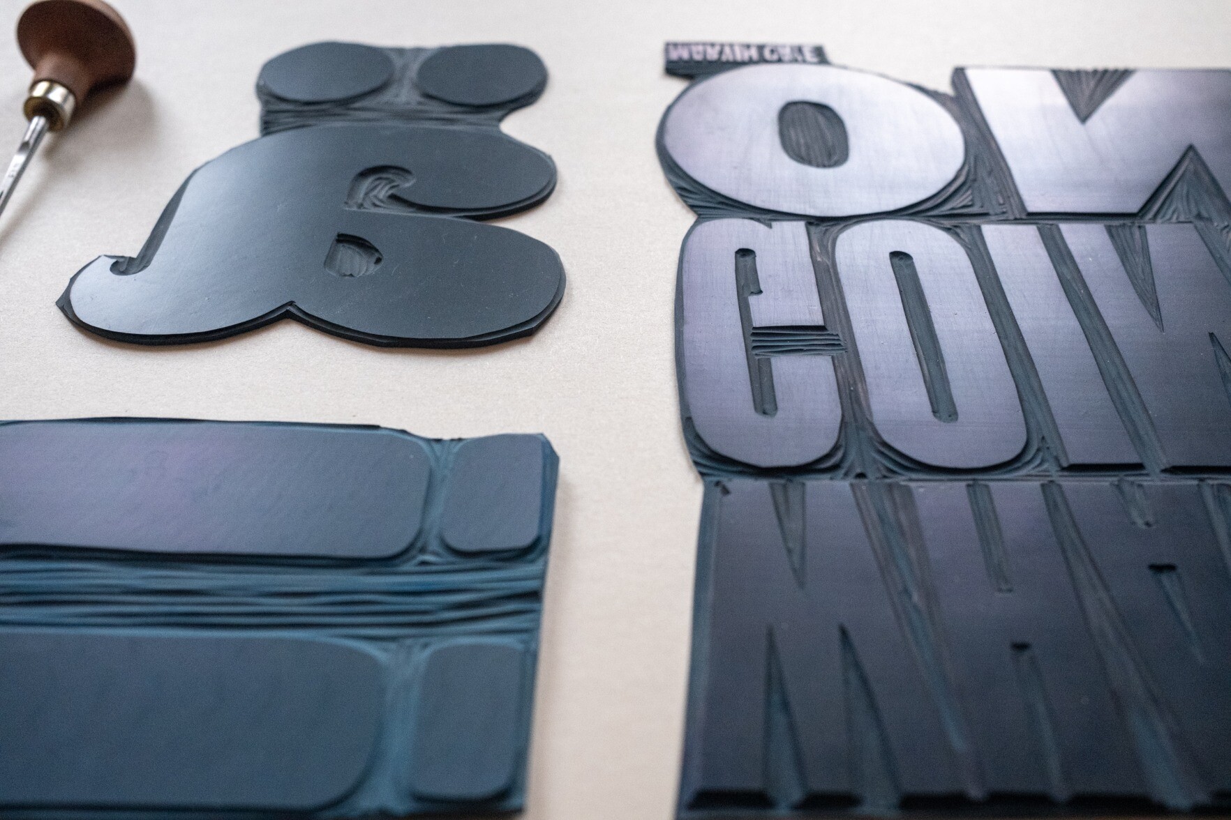 Linoleum letterforms printed on found paper for collage. #collage #artistsonmastodon #contemporarycollage