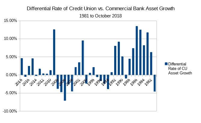 Not sure why I felt compelled tonight to graph the differential growth rate of US #CreditUnion assets vs. those of commercial banks, but here we are...