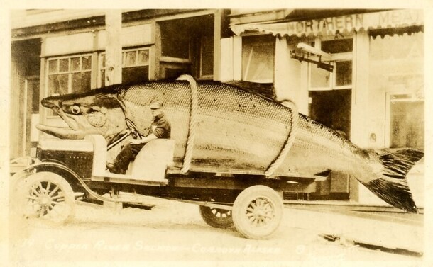 1930s truckload of salmon in Cordova postcard, inscription at bottom says, "Copper River Salmon, Cordova, Alaska." #alaskahistory #alaska #cordova