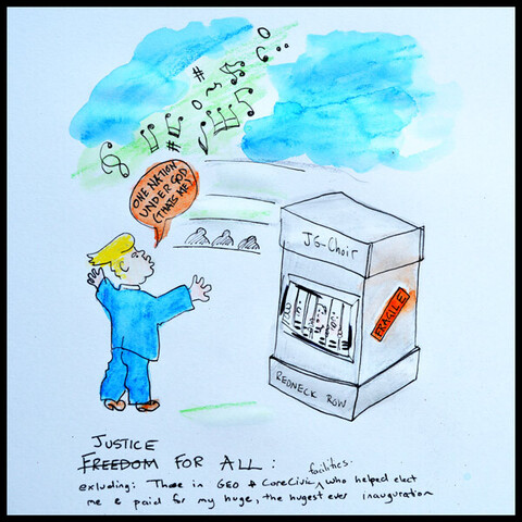 Justice for All . Trump & J6 Choir. Of course the more people in prison may benefit Trump through generous owners of the prisons. #GEO #CoreCivic #TRump #USPolitics #justiceforsall #spotify #freedomofspeach #spotify #j6 #music #art #cartoon
