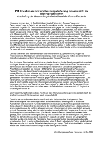 Dann wurden Platzverweise erteilt, Ordnungsgelder angedroht und einige Fahnen und Transparente beschlagnahmt. Auch die Personalien von einzelnen Aktivist*innen, die angeblich gegen die Abstände verstoßen hätten, wurden aufgenommen. --> trotz Anmeldung & Genehmigung, Mundschutz und Handschuhen nutzt die Polizei die „Corona-Krise“ als Vorwand, um legalen Protest einzuschränken oder unmöglich zu machen.