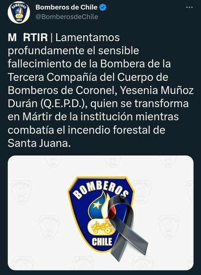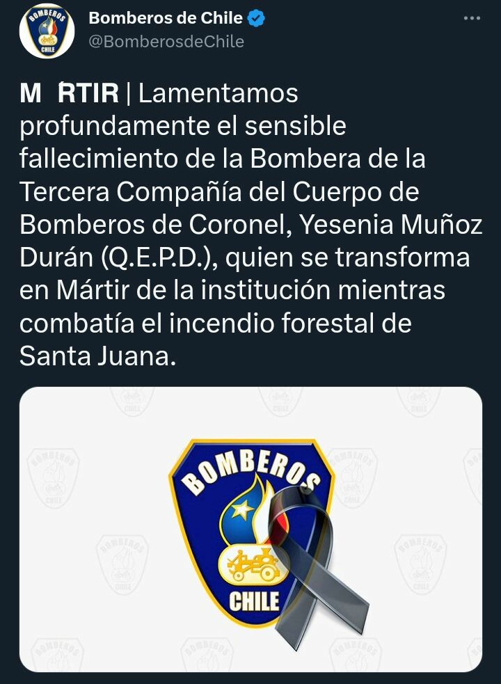 La bombera, de 37 años, pertenecía a la Tercera compañía del cuerpo de Bomberos de #Coronel.