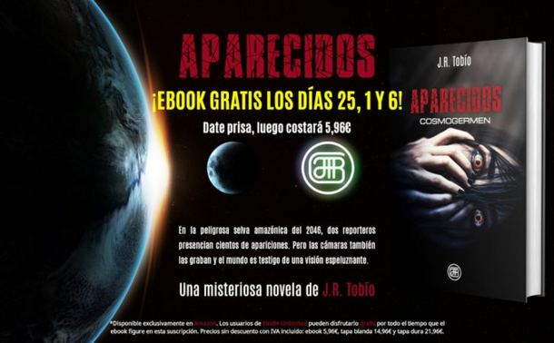 Obtén tu regalo buscando en Amazon la palabra Cosmogermen y eligiendo la opción de ebook. También puedes con un clic pulsando en el enlace https://www.jrtobio.com/aparecidos_gratis_los_dias_25_1_y_6.php