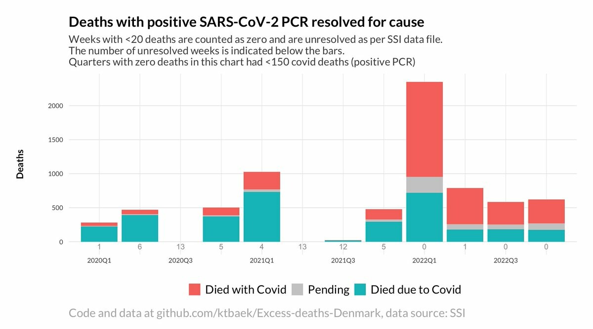 Covid deaths (positive PCR) in Denmark resolved for cause of death. Thanks to @SSI_dk@twitter.com for providing this dataset🎄