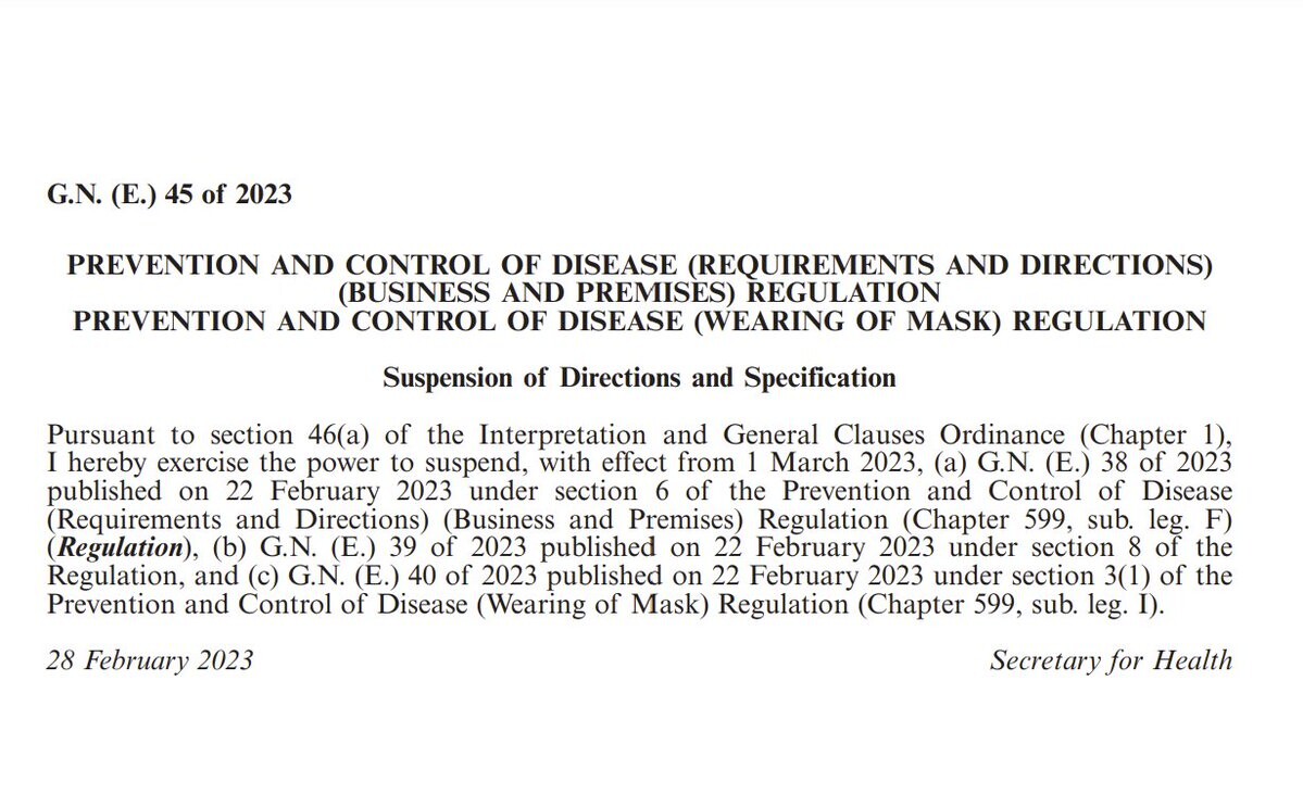 It's official. Starting tomorrow the relevant sections of Cap.599f and Cap599i will be suspended from March 1st, meaning no more legal mask mandate in Hong Kong.