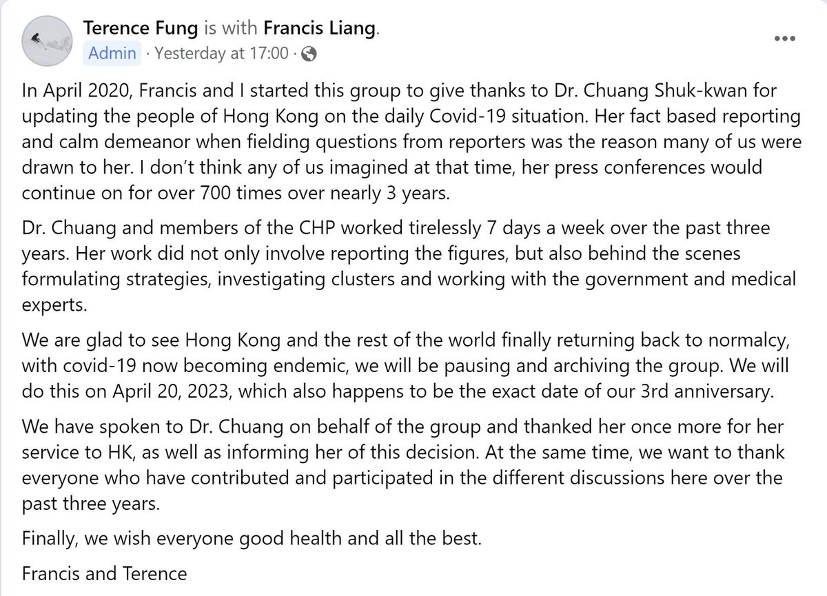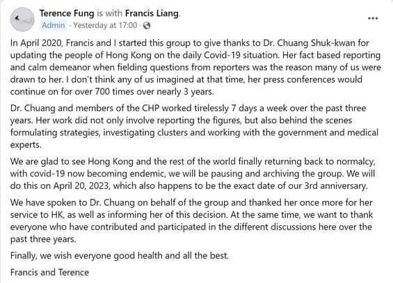 The "Dr. Chuang Shuk Kwan 張竹君 Fanpage" on Facebook will come to an end on April 20th.