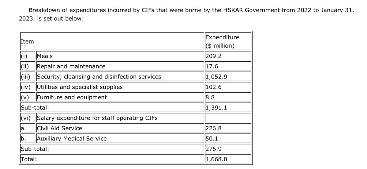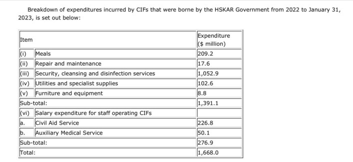 From 2022 to end-January 2023, the Hong Kong government spent $1.668 billion on its Community Isolation Facilities; with $209.2 million going toward meals and $1.0529 billion on security, cleansing and disinfection services https://twitter.com/i/web/status/1653676494819061764