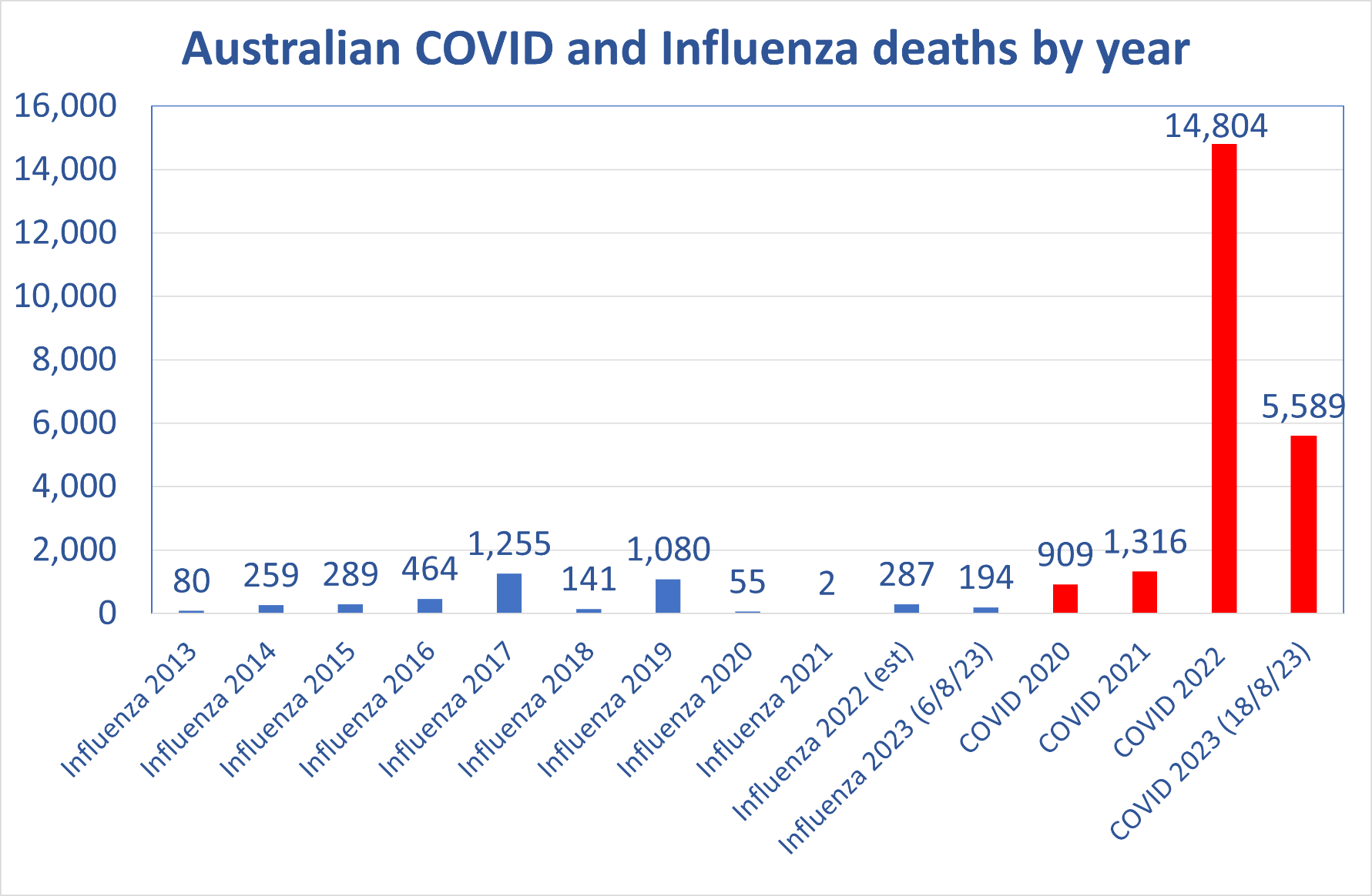 "While governments pretend that COVID has gone away, death data tell a different story. Australia has had 5,589 reported COVID deaths & 194 flu deaths so far in 2023. The death rate from COVID is 28 times higher than the death rate from flu. How much longer will Australia remain in denial?"