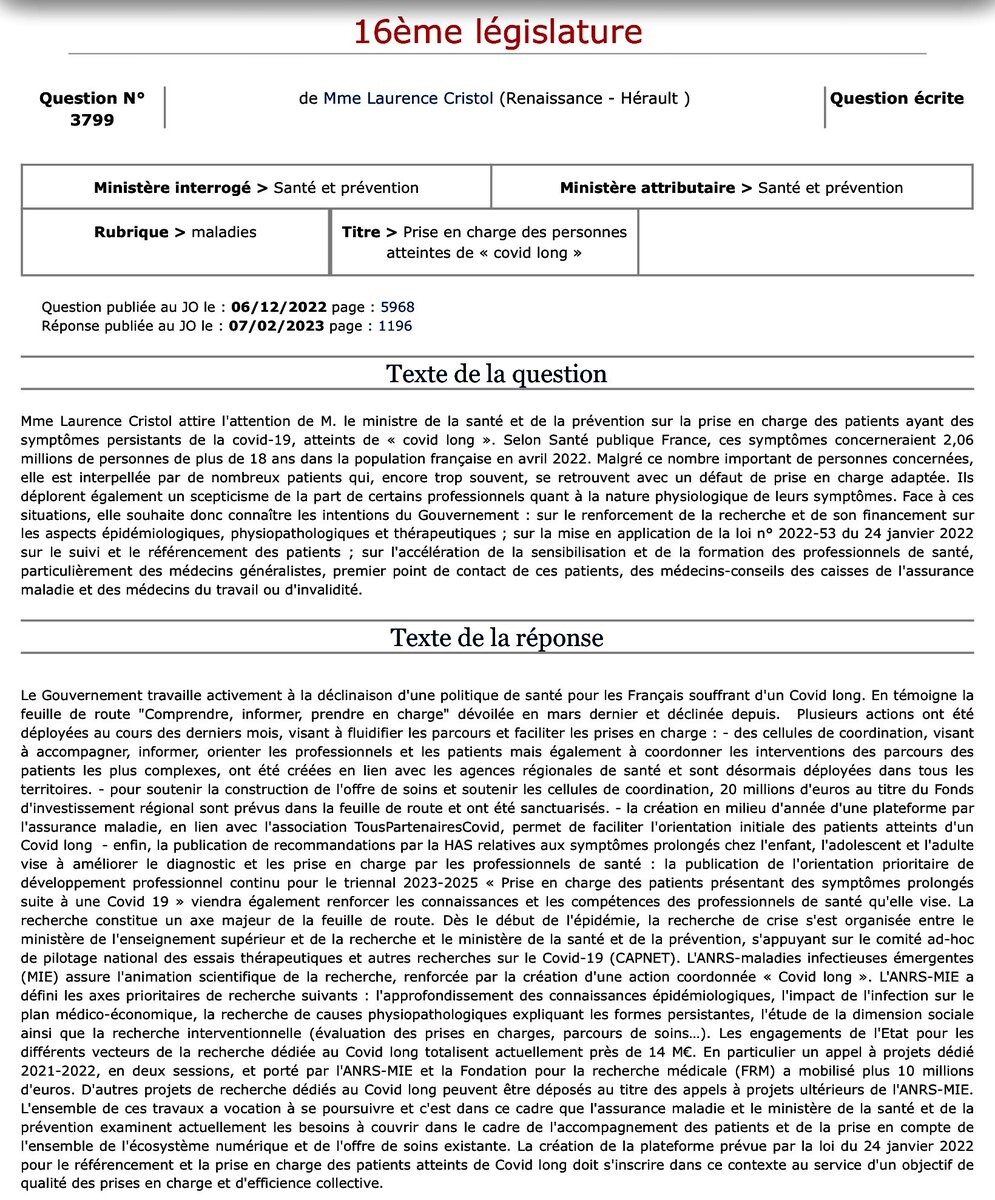 Plusieurs parlementaires dont moi même avons interpellé à de multiples reprises le gouvernement sur l'absence d'application de la loi #Covidlong. Pour seule réponse j'ai eu "informer les patients, fluidifier la prise en charge" et autre jargon de ministre qui ne veut rien faire. https://nitter.net/GaetanGracia/status/1678795000232935432