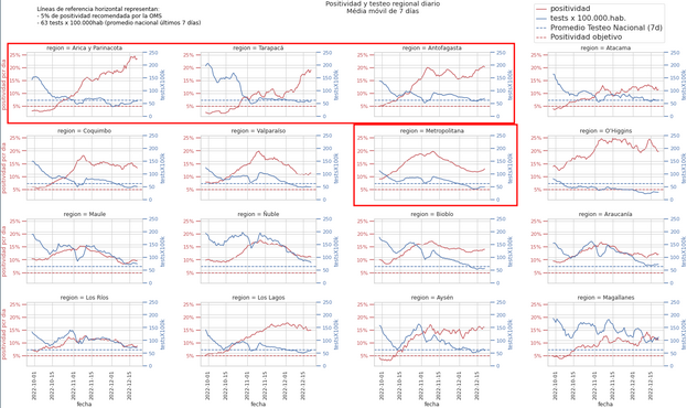 La RM, por su enorme volumen de personas, suele opacar la estadística de todas las otras regiones, y ha dejado de bajar. Hoy con 12.33% de positividad, vuelve a aumentar.