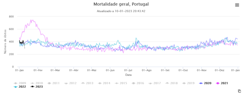 Daqui a uma semana farão 2 anos do inicio do último confinamento. Vendo as curvas de mortalidade desse fatidico mês de Janeiro de 2021 (abaixo) vemos o quanto a morte nos marcou nesse periodo.