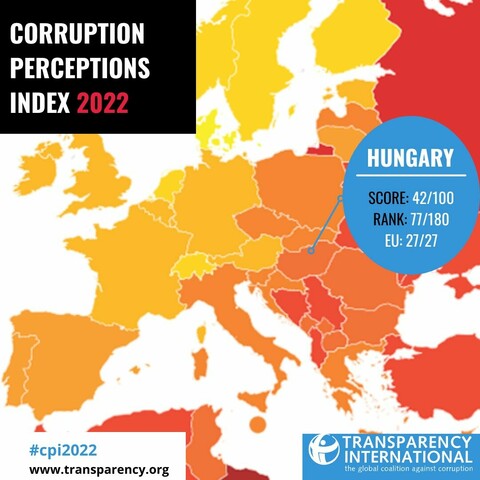 By losing 1 point, Hungary scored 42 out of total 100, according to the results of #CPI2022! By this score, the country reached the 77th position out of 180.