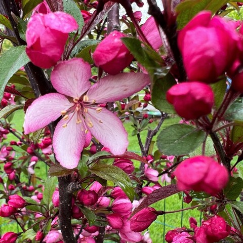 Flowering Crabapple… Flowering! The recently-planted crabapple trees arrived covered with buds that are now opening. This coming week should see a flash of color from those youngins! #trees #blooms #crabapples