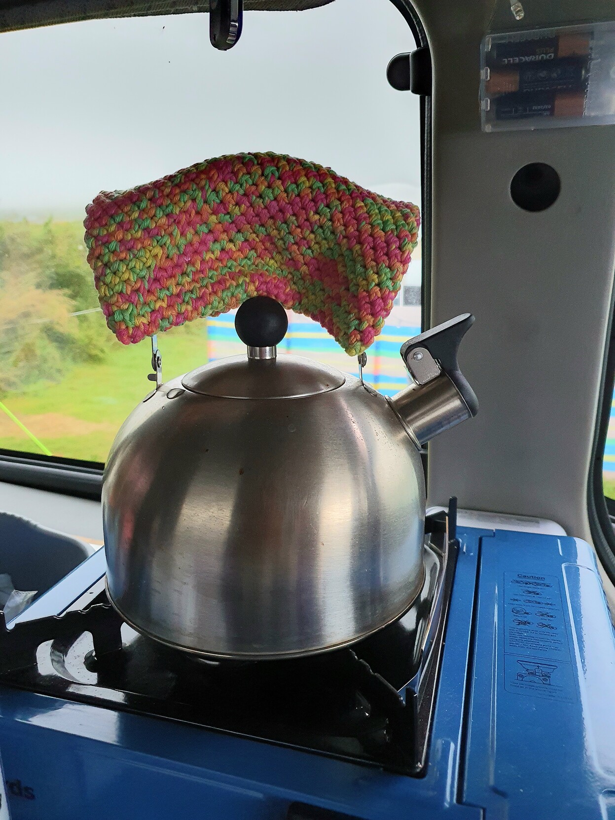 Made a hot-pad/holder thing for my kettle coz I've been using a tea-towel for ages in my van. I've one of these in blue in my husbands van but forgot to make one for my own kettle.