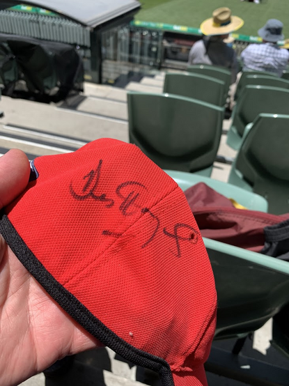 I stood up after an over to stretch my legs and behind me were 2 blokes struggling to take a selfie with Desmond Haynes. I offered to take a photo for them, and they walked off happy. I asked Desmond if he'd autograph my cap, which he was quite happy to do. After a nice chat he went off to do some interviews.