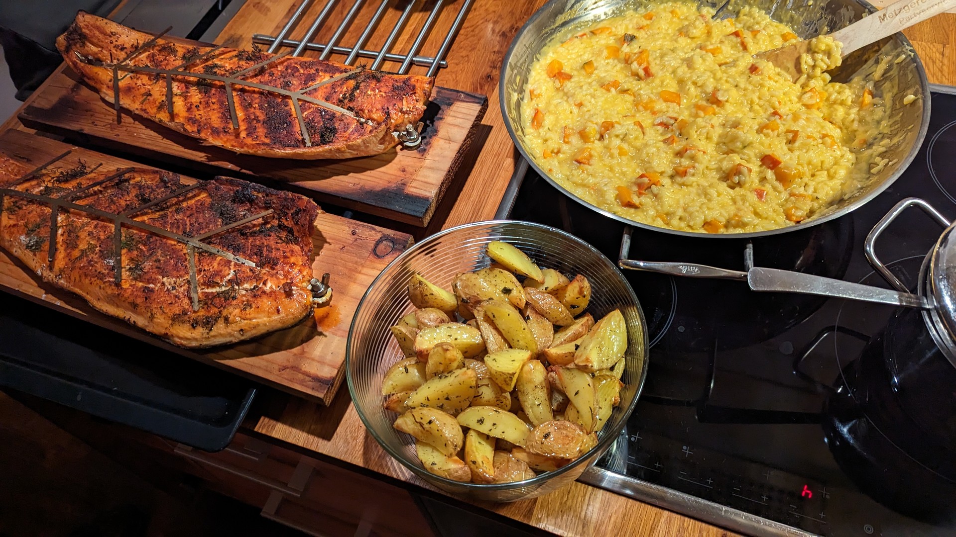 Gestern gab es Flammlachs mit Kürbis-Risotto, Rosmarinkartoffeln, Meerrettich-Wasabi-Sauce sowie Honig-Senf-Dill-Sauce. (u.a. #CrôssKitchen).