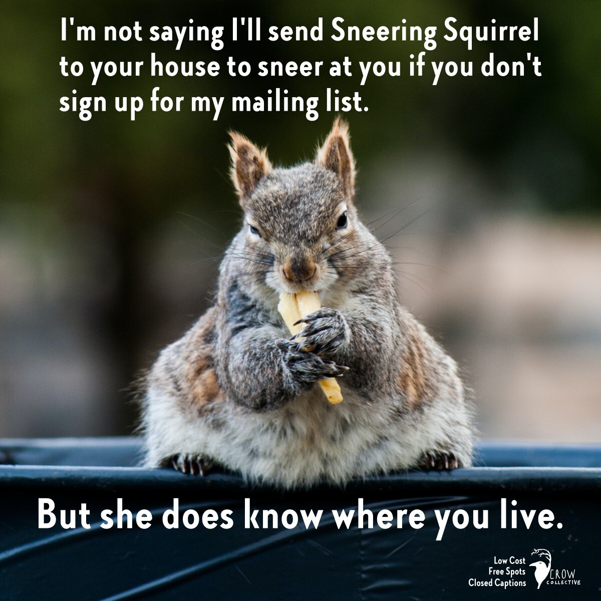 I'm not saying I'll send Sneering Squirrel to your house to sneer at you if you don't sign up for the Crow Collective mailing list, low cost online writing workshops. (But she does know where you live.) Sign up here: https://crowcollectiveworkshops.com/mailing-list/