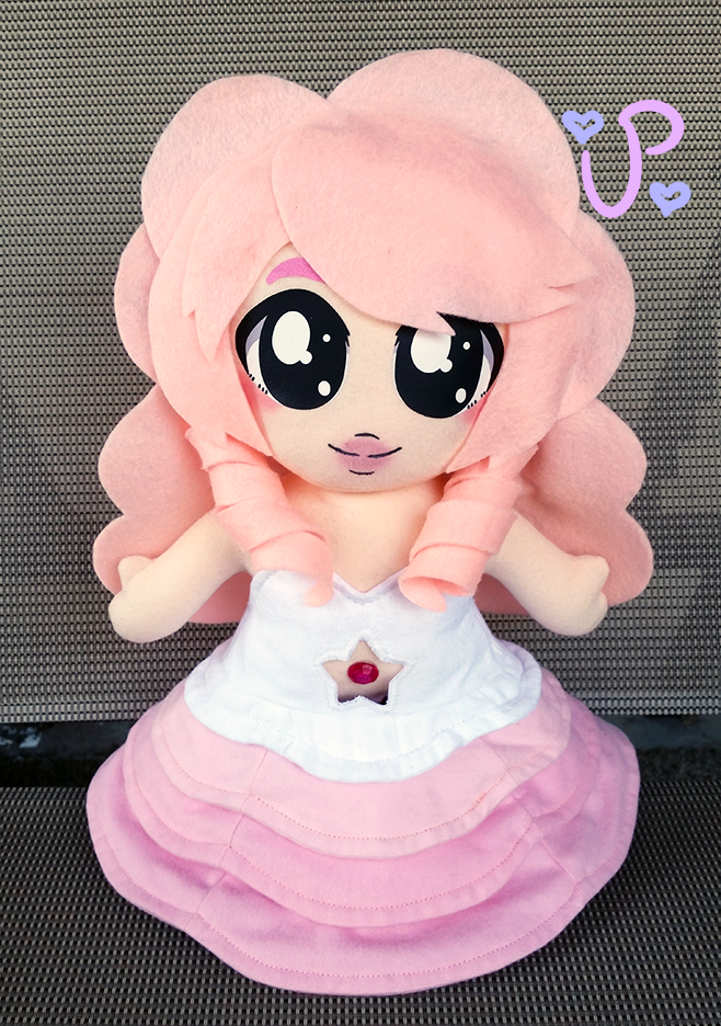 Today I have Rose Quartz from the cartoon Steven Universe! I bet most of you out there already knew that just by looking at her though. I love Steven Universe and Rose Quartz might be my favorite crystal gem. I tend to flip flop between her and Garnet XD I just love how Rose is this mysterious, almost deity or legend-like figure in the show. Being both a rebellion leader and a warrior as well as someone that longs for peace is such an interesting character to me. Getting to plush a character like that was really a joy! I'd love to make more SU characters, but a lot of the crystal gems have weird shaped heads and things that I don't know how I'd even do them >___>