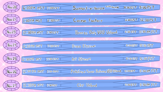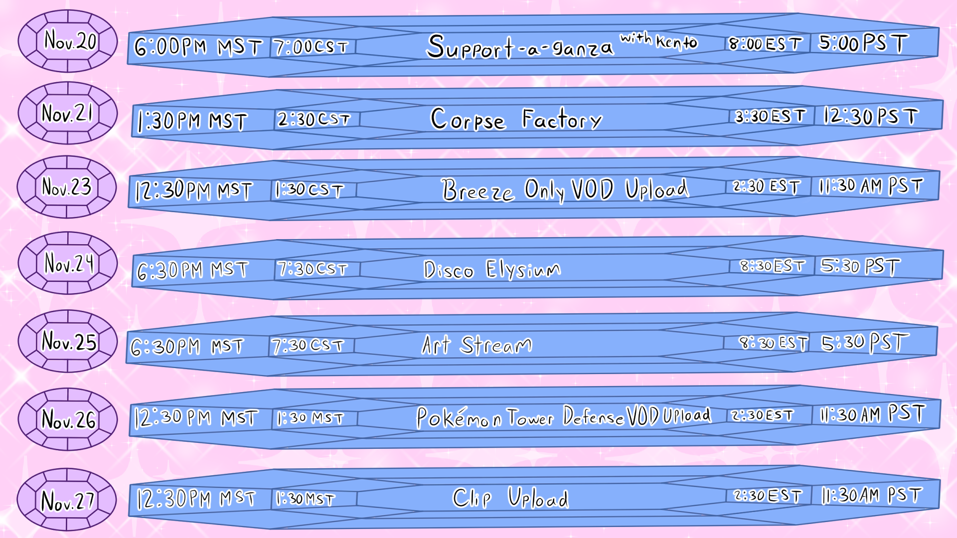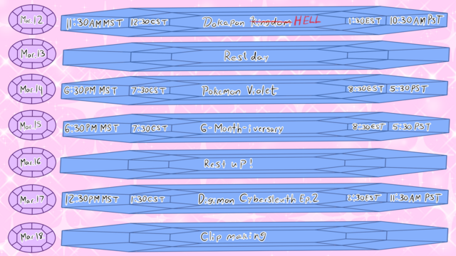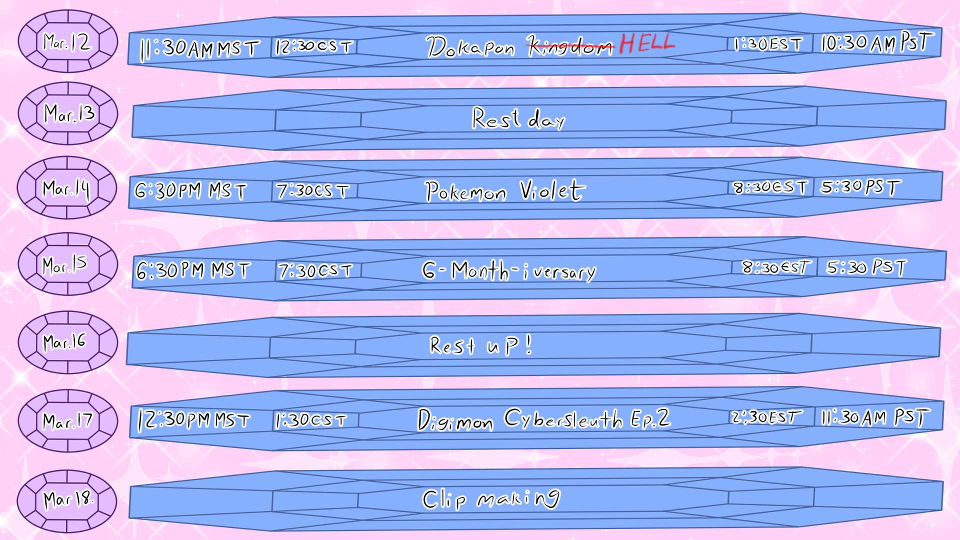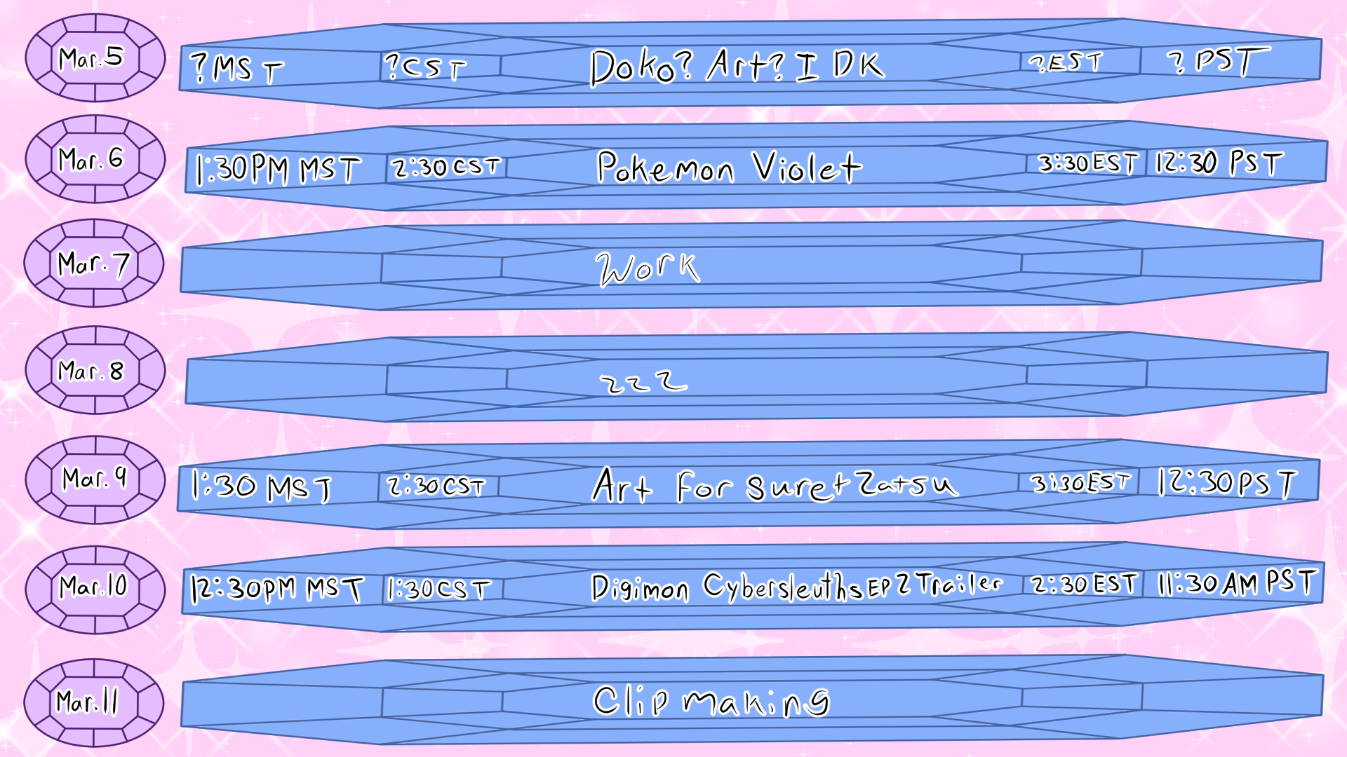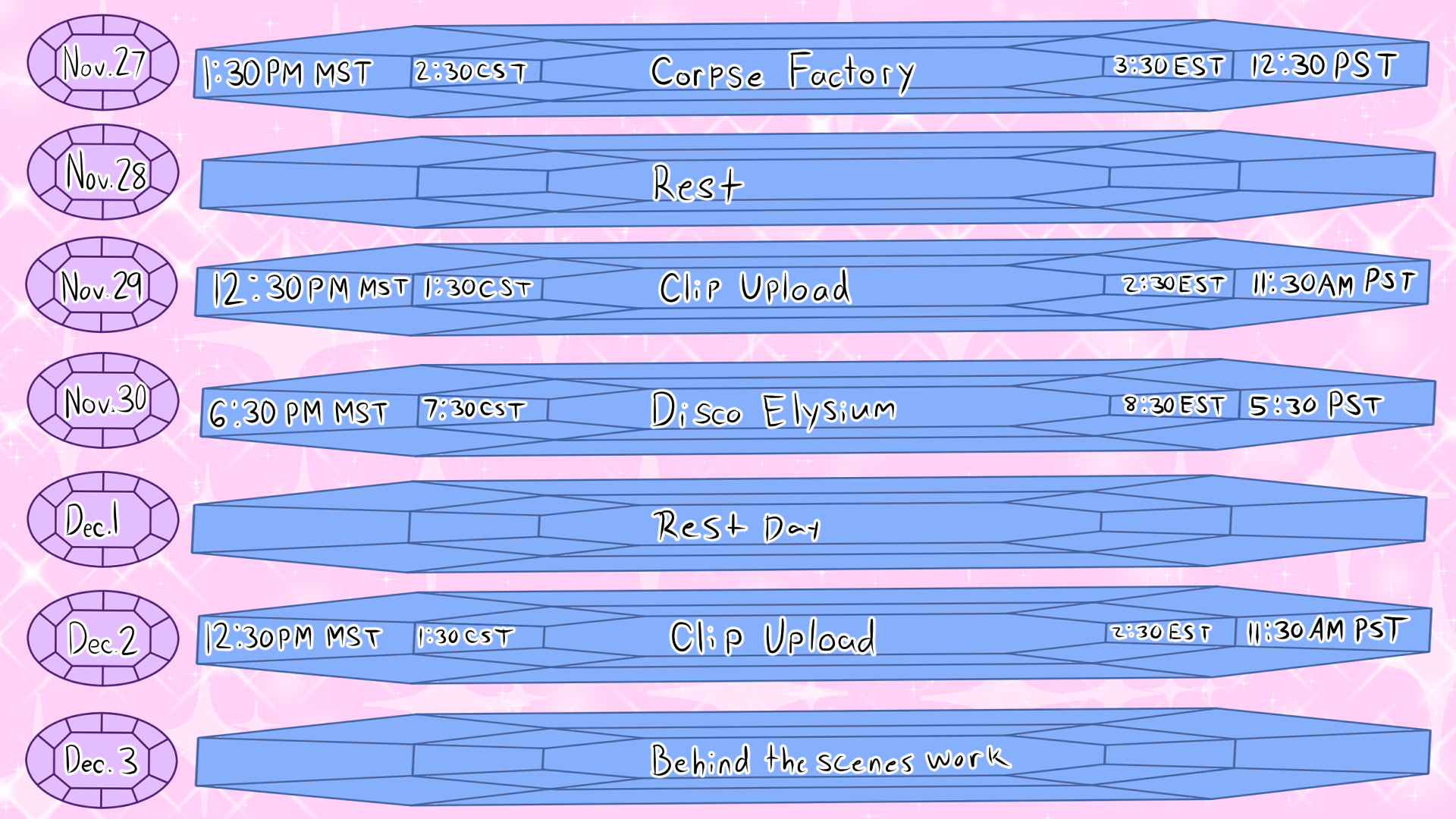 Here is my schedule for everyone, Next month is going to be a big gong show! So I will need the rest and time for my classes and me. Anyways use #CrystallinedArt for SFW Fan art and #CrystalLook for anything you want me to support on stream!