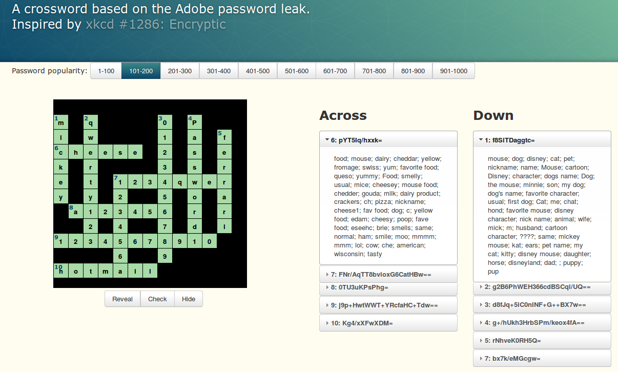 le meilleur mot croisé pour les fans de #cryto : retrouver les mots de passe adobe de via l'indice stocké en BDD :
