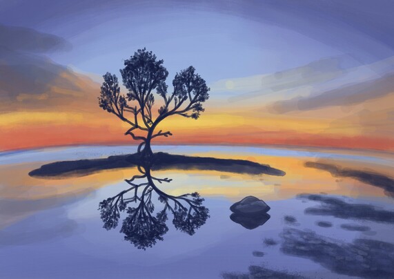 A fairly quick watercolor-style piece. I wanted to paint this from the #CuratorPrompts for the striking colors of the #sunset Tweaked the colors of the tree, rocks and algae to fit the hue for this Huevember day more. Drawn in #Krita.