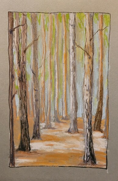 Pastel pencil on tan toned paper; Pexel: Taryn Elliott, cc: View on lower parts of pines in forest