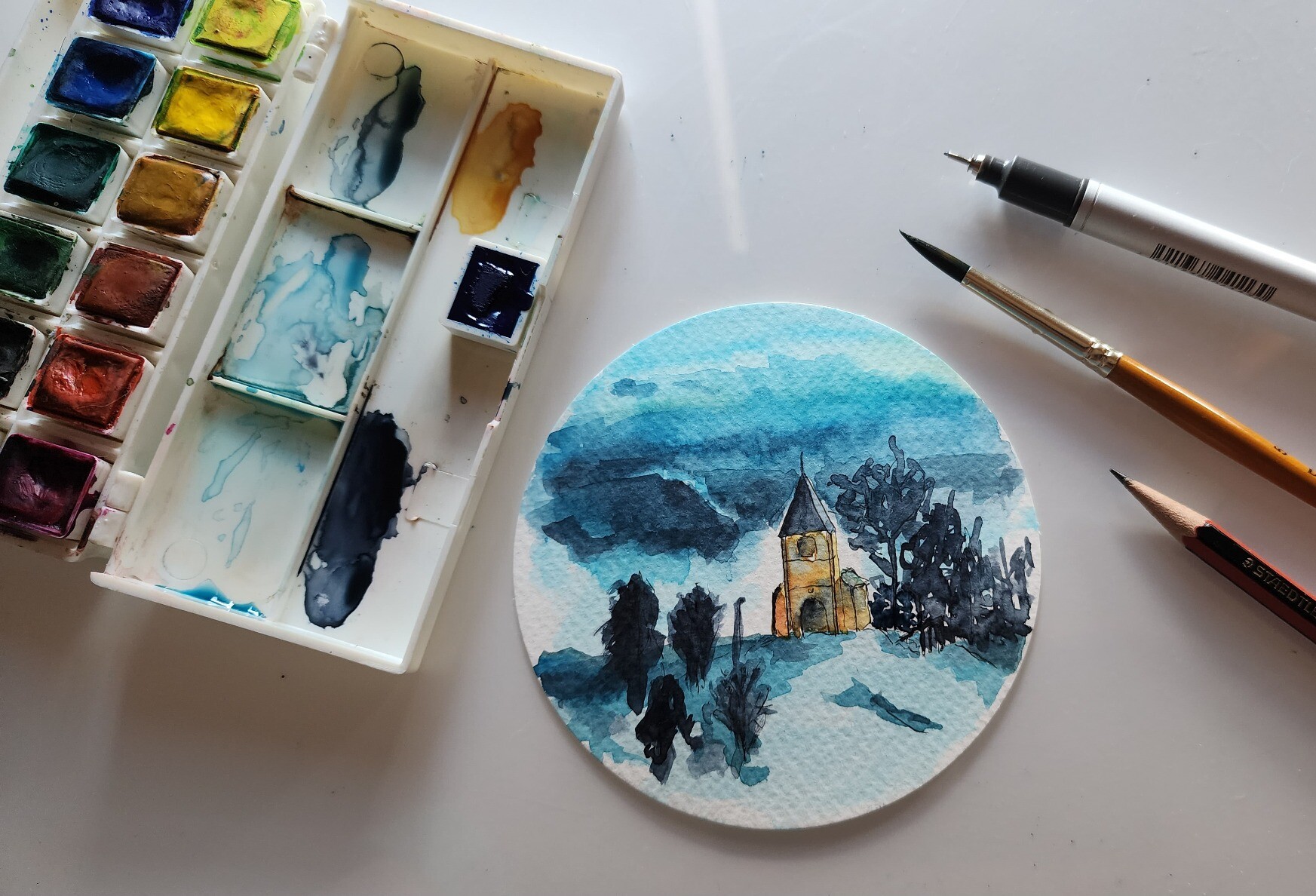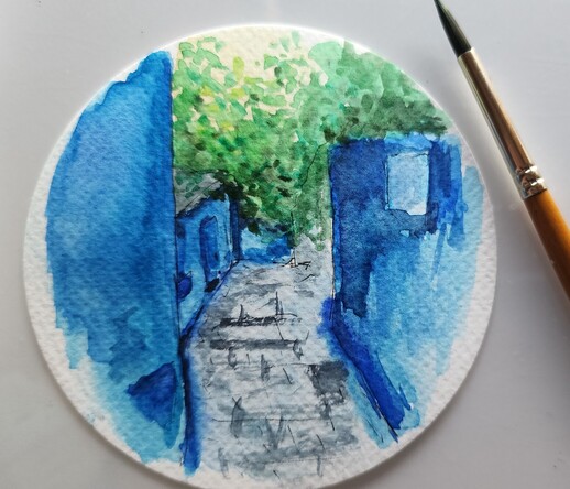 I chose aquarell colours and fineliner for this #5MinuteSketch all 4 on a double page of A5 aquarell sketchbook landscape.