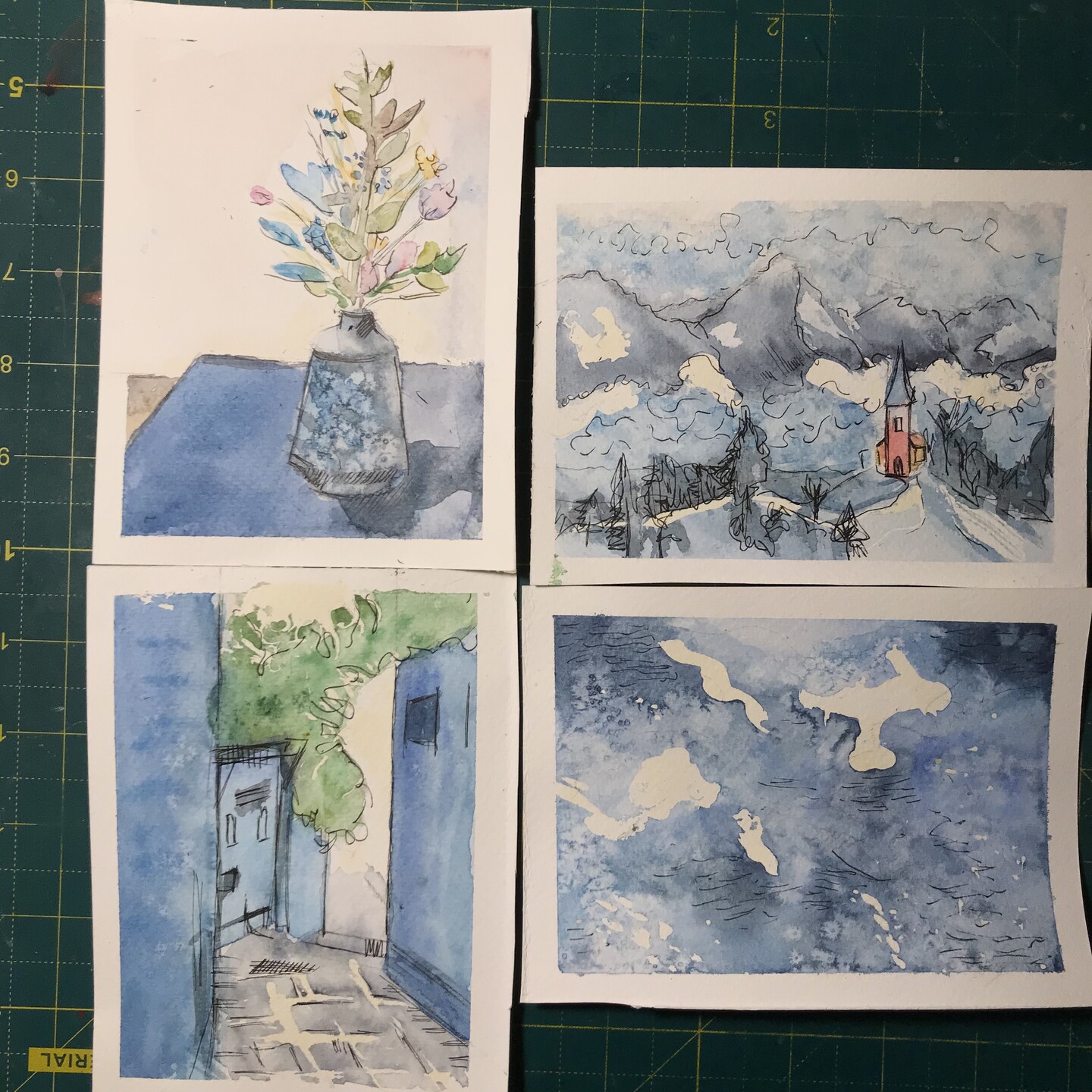Så jag är allmänt hudlös och kör alla 4 #CuratorPrompts150 som varsin 10 minutersskiss med akvarell, maskeringsvätska, tejp och fineliner.