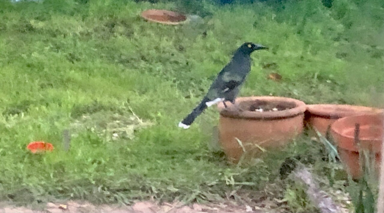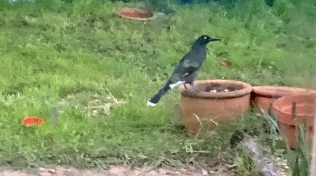 A juvenile Currawong who lives in the front, who occasionally jumps in the front bath, makes a surprise visit in the yard. No magpies around, so Lofty is safe, for now.