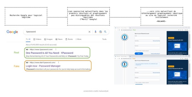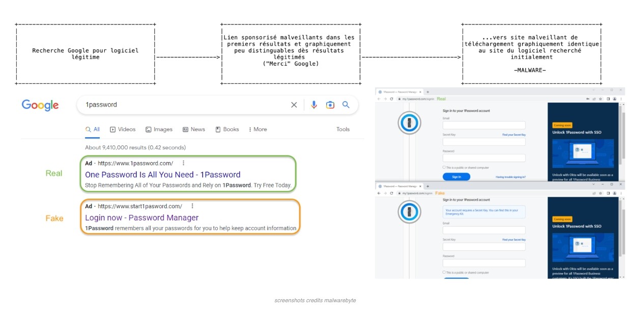 Liens sponsorisés GoogleAds utilisés pour crédibiliser la chaîne d’infection vers des téléchargements malveillants hébergés sur des sites se faisant passer pour les sites officiels de certains logiciels bien connus