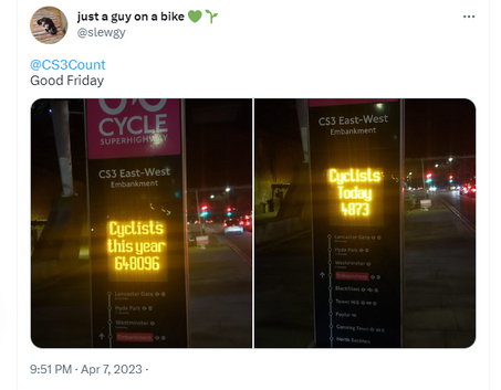 7 April'23: report by @slewgy@twitter.com of the cycle journey counter on #London's #cycleway #CS3 #C3 along Victoria Embankment.