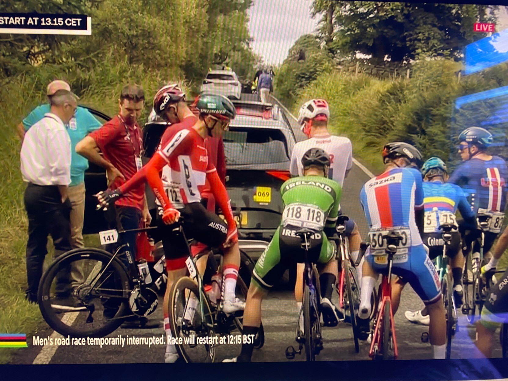 Oooh what’s happening. They’re stopping the race momentarily. #CyclingWorldChampionships