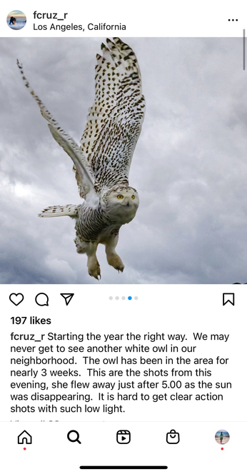 Snowy Owl Update: Heβs moved 8 doors down. Been told he flies at sunset to a new house. Found a photographer on Instagram (fcruz_r) who caught owl in flight. It seems happy. So amazing! π¦βοΈ π #SnowyOwl #Owl #CypressCA