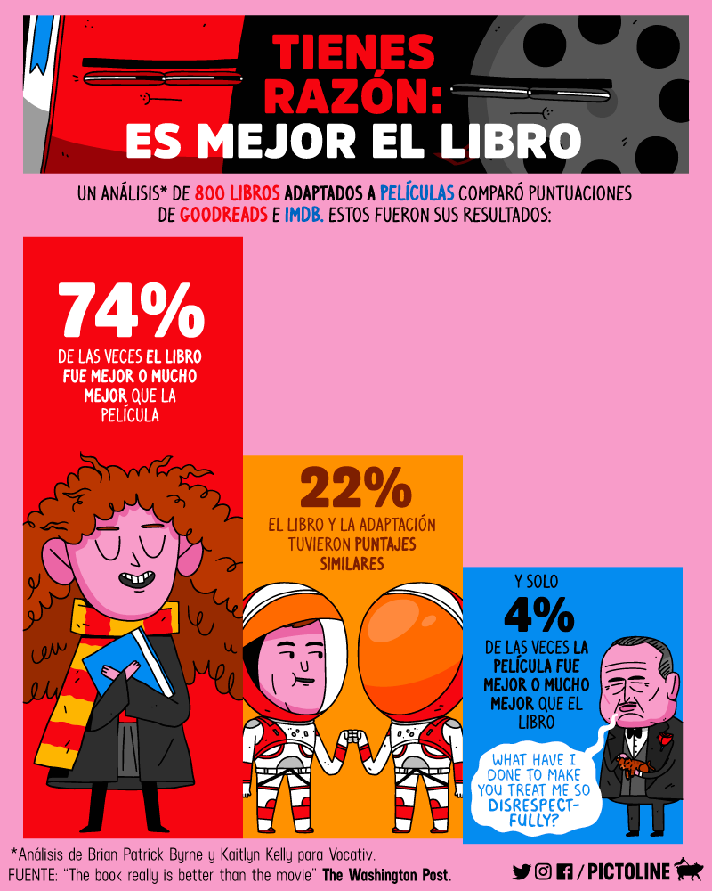 Un análisis comparó las calificaciones de 800 libros con sus respectivas adaptaciones cinematográficas y al parecer sí, sí es mejor el libro 📕🏆