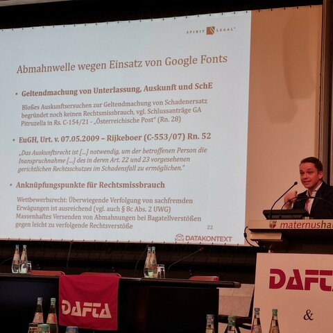 @TilmanHerbrich@twitter.com klärt auf der #DAFTA2022 über Auskunft und Schadensersatz nach DS-GVO auf, im Fokus steht u.a. der Umgang mit der Google Fonts Abmahnwelle